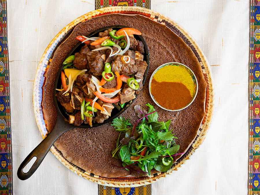 Strimler af Injera blandet med tomater, krydret Berbere sauce, hvidløg, tesmi smør, løg og vælg imellem oksekød og lam.